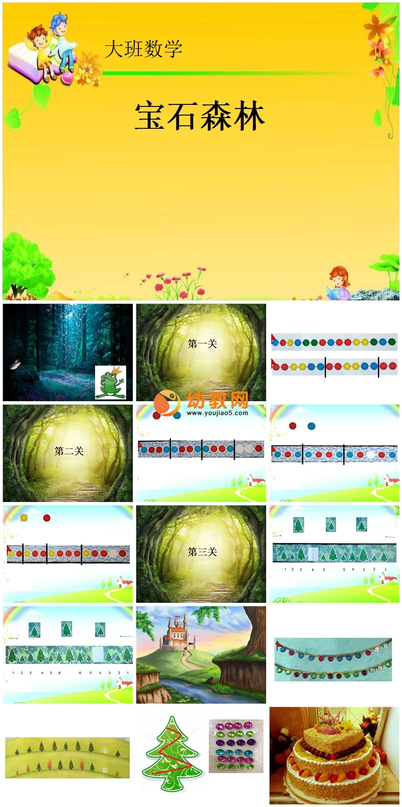 在寶石森林里有很多的寶石。寶石森林的主人青蛙王子想邀請我們小朋友去寶石森林里做客,但是我們必須要闖過三道關,才能到達寶石城堡。你們愿意接受挑戰嗎?