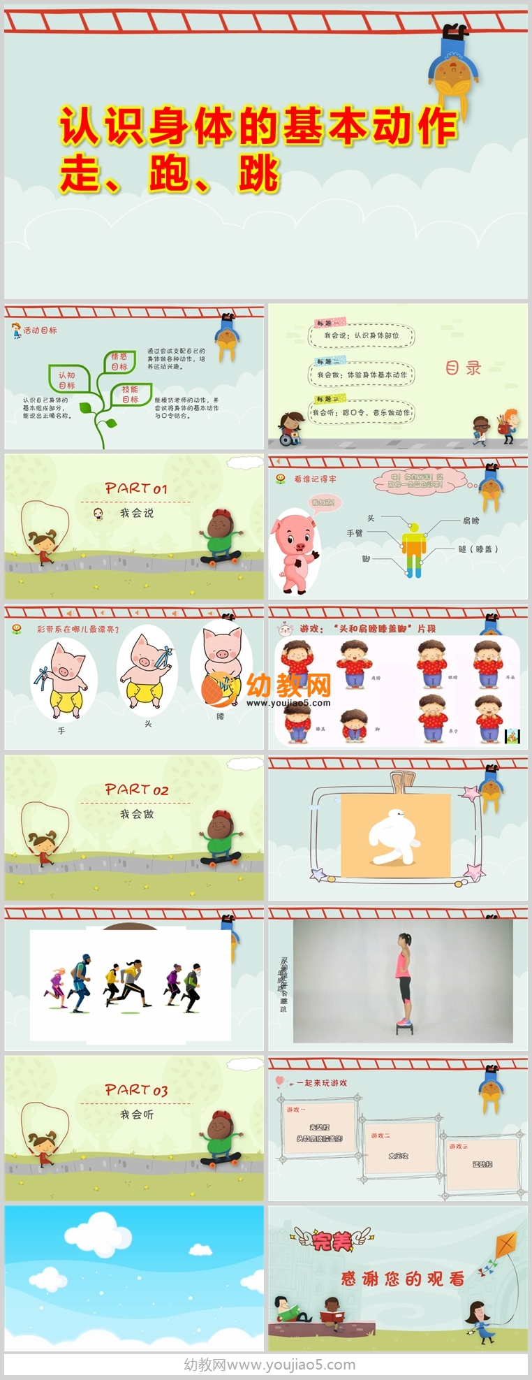 【小班健康《認識身體的基本動作:走、跑、跳》PPT課件】相關文章: